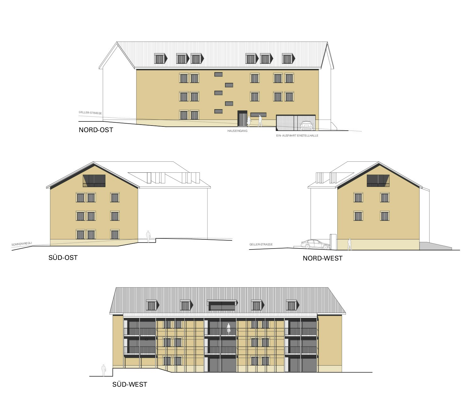Die Häuser «B» und «C» sind vom Fuss- und Radweg Sonnenwegli her erschlossen. Dieser Weg ist eine direkte Verbindung zum Dorfzentrum und zu den öffentlichen Haltestellen von Bus und Bahn. Alle Häuser sind typologisch gleich aufgebaut: Dreispänner mit Lift/Treppenhäuser, Hauseingänge auf der Nordostseite (hangseitig), eine vertikal begrünte Balkonschicht auf der Südwestseite und ausgebaute Dachgeschosse unter den Satteldächern. Die Nordwest und die Südostseite weisen, unter Berücksichtigung des sommerlichen Wärmeschutz, möglichst wenig Fensterfläche auf. Zu jedem Haus gehört ein Veloschopf, welcher für Bewohnerinnen und Bewohner sowie Besucherinnen und Besucher benutzbar ist.